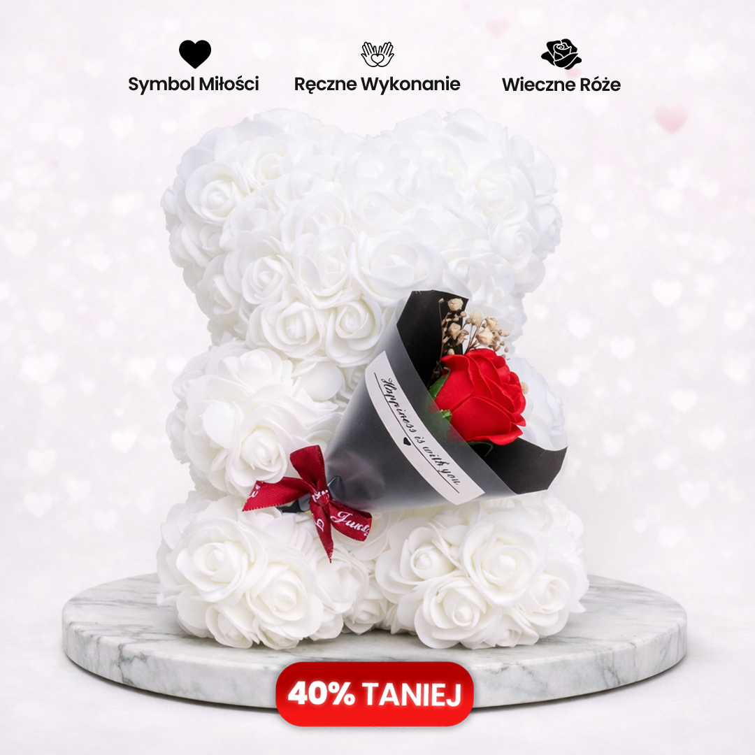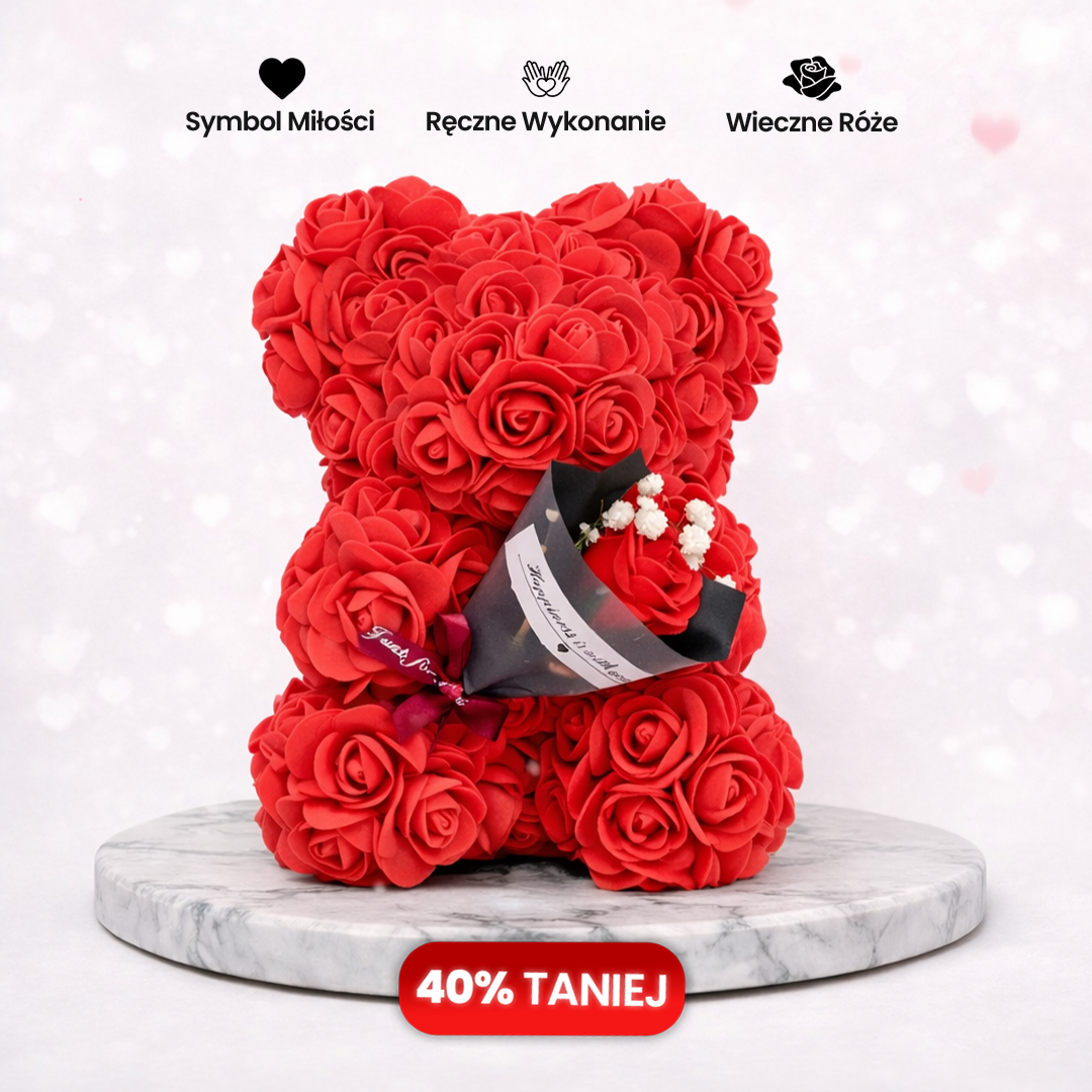 Różany Miś łączy w sobie emocje kwiatów i trwałość pamiątki. Nie więdnie jak bukiet, nie znika po kilku dniach - zostaje na długo jako symbol uczucia, pamięci i troski. To prezent, który naprawdę robi wrażenie przy wręczaniu.